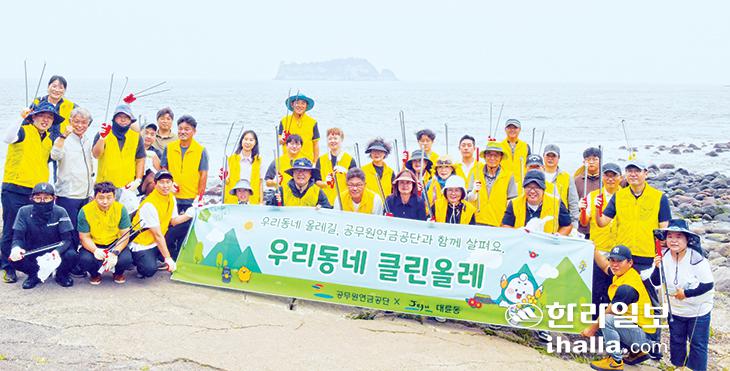 지난달 25일 공무원연금공단이 서귀포시 대륜동 주민자치위원회와 함께 '대륜동 해안 올레길'에서 플로깅(plogging)을 하기전에 기념사진을 찍고 있다. 이상국기자