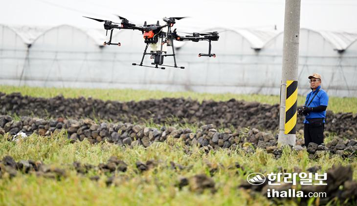 장마전선이 소강상태로 접어들며 비교적 맑은 날씨를 보인 3일 농민이 드론으로 농약을 살포하고 있다. 강희만기자