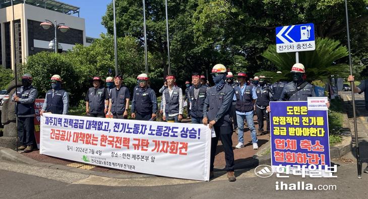 민주노총 전국건설노동조합 제주지부 전기분과 조합원 일동은 4일 한국전력본부 제주지부 앞에서 기자회견을 열고 "전력 공급과 긴급공사에 대한 대책 없는 한국전력을 규탄한다"며 "연차투쟁과 함께 주말과 야간 돌발대기를 전면 거부한다"고 밝혔다.