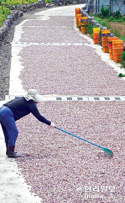 무더운 날씨가 이어진 8일 제주시 애월읍 구엄리에서 농민이 씨앗용 마늘종자를 강한 햇살 아래에서 말리고 있다. 강희만기자