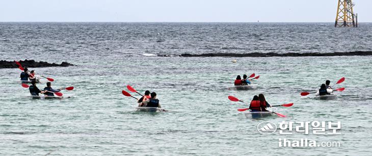 9일 제주시 구좌읍 월정리 해안에서 관광객들이 투명카약을 즐기고 있다. 강희만기자