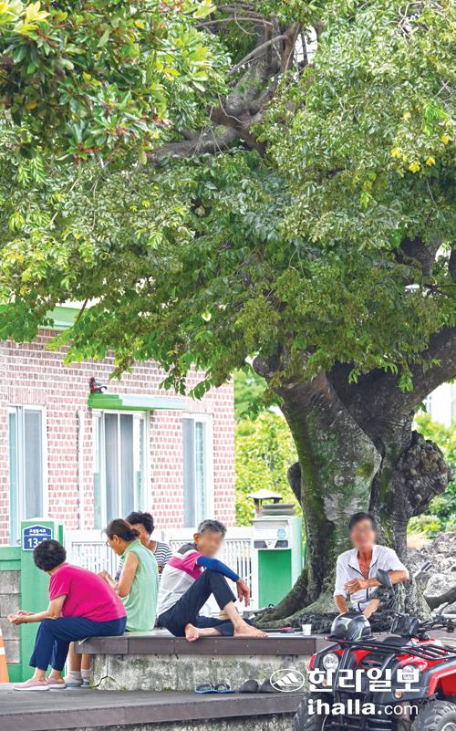 9일 서귀포시 성산읍 고성리 마을 주민들이 무더위를 피해 나무 그늘에서 담소를 나누며 휴식을 하고 있다. 강희만기자