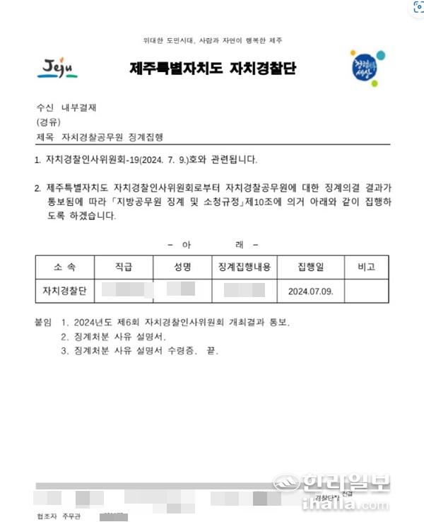 징계 대상자와 징계내용 등이 그대로 노출돼 정보공개포털에 공개된 제주자치경찰단의 원문정보.