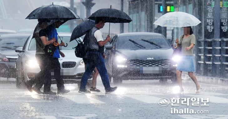 장맛비가 내린 10일 오후 제주시청 인근에서 시민들이 우산을 쓰고 횡단보도를 건너고 있다. 이상국기자