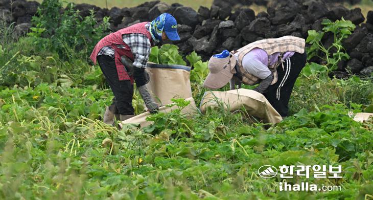 11일 제주시 한림읍 수원리 한 농경지에서 농민들이 단호박을 수확하고 있다. 강희만기자
