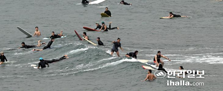 [한라일보] 14일 서귀포시 중문해수욕장에서 많은 서퍼들이 파도를 즐기고 있다. 강희만기자