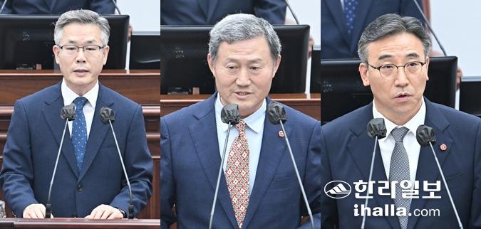 15일 열린 제주자치도의회 제430회 임사회 본회의에서 인사말 하는 진명기 제주자치도 행정부지사, 김완근 제주시장, 오순문 서귀포시장. 제주자치도의회 제공