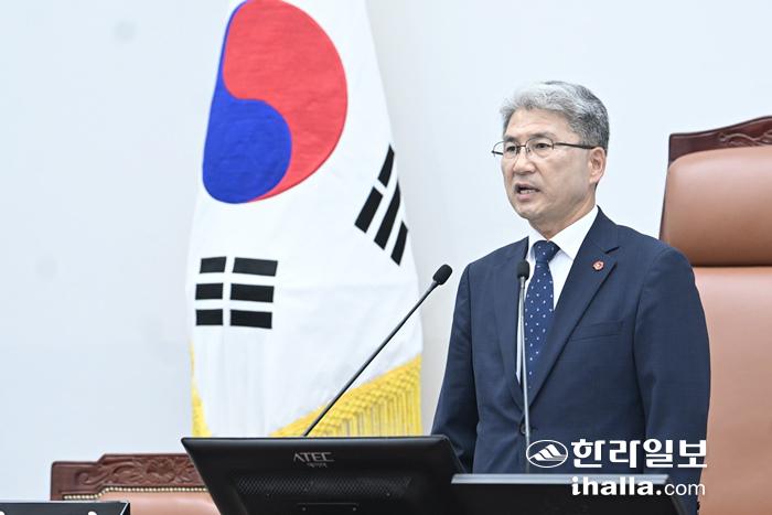 15일 열린 제주자치도의회 제430회 임시회 본회의에서 인사말하는 이상봉 제주자치도의회 의장.