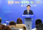 지난달 26일 취임 2주년 기자회견에서 조직개편의 필요성을 강조하는 김광수 교육감. 한라일보DB