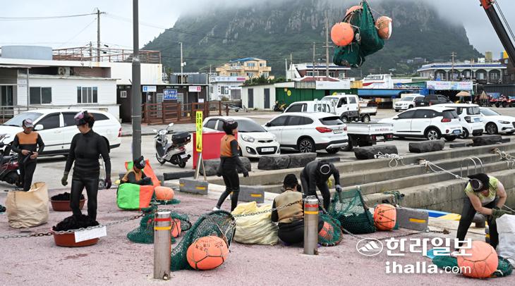 [한라일보] 16일 서귀포시 사계항에서 물질을 끝낸 해녀들이 수확물인 성게를 정리하고 있다. 강희만기자