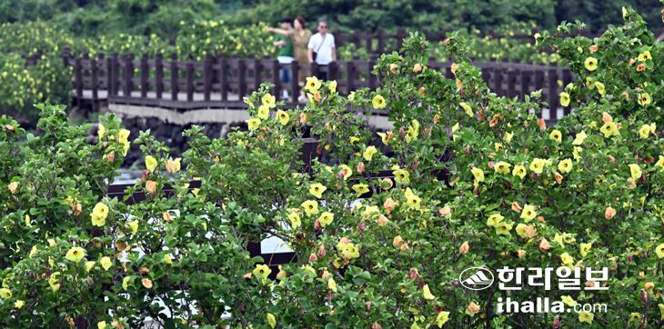 [한라일보] 17일 서귀포시 성산읍 오조리 식산봉 자생지에 노란 황근이 만개해 장관을 이루고 있다. 강희만기자