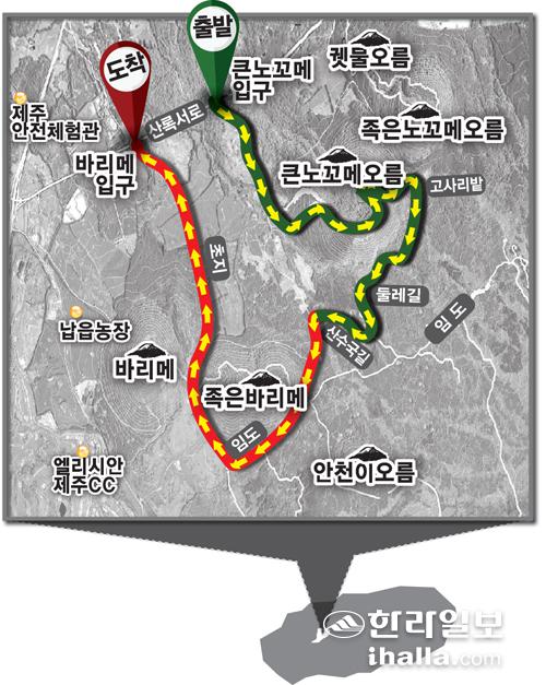 [한라일보] 비 내리는 유월의 끝자락이다. 청년시절 오름의 매력에 빠질 즈음, 노꼬메와 바리메는 제일 많이 찾았던 오름이다. 프랑스어 같기도 하고 몽골어처럼 신비한 오름 지명이 내 마음을 당겼던 것이다.
