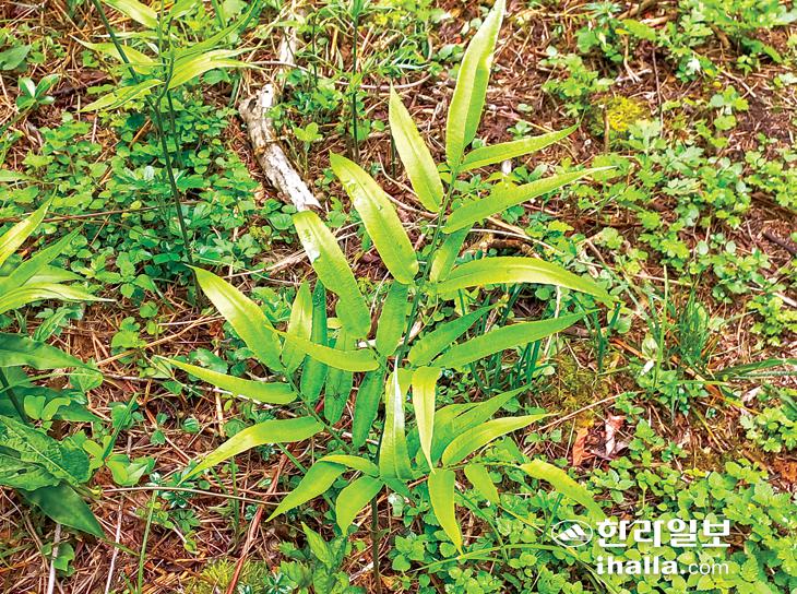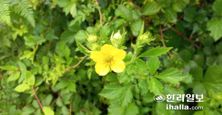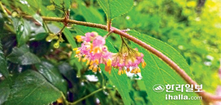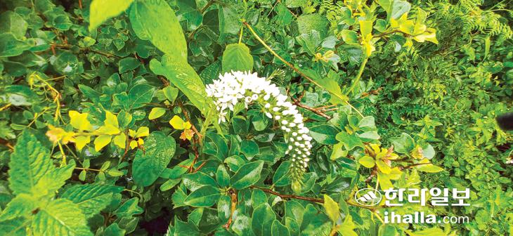 탐방은 산록서로 노꼬메 입구에서 시작했다. 비가 많이 내려 버스에서 우의를 입는 등 완전 무장했다. 우중산행 경험이 풍부해서인지 갖가지 우의가 등장했지만 필자는 주최 측이 내어준 비닐우의를 걸칠 수밖에 없었다. 빗속에서 우리는 걷는다. 자연을 만나 숲과 소통하는 방법은 여러 가지 있지만 폭풍우 속에서 숲이 전하는 아늑함은 특별한 기쁨이다. 목장 길가의 야생화들이 비를 맞고 고개를 숙이고 있다. 그들은 바람보다 먼저 일어나 꽃을 피울 것이다.