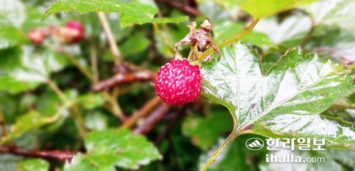 노꼬메 정상에서 하산해 뒷사면 둘레길을 걷는다. 비는 계속되고 우리는 안전한 발걸음을 위해 땅을 보며 걸었다. 먼 시선을 줄 겨를이 없다. 숲의 요정 산수국 군락이 나타났다. 우중 오아시스를 만난 환희의 순간이다. 유월말이라 개화한 지 얼마 안됐지만 빗물 품은 잎사귀와 꽃의 모습은 오히려 영롱하다. 게다가 듬성듬성 빨갛게 익은 산딸기를 따먹기도 했다.