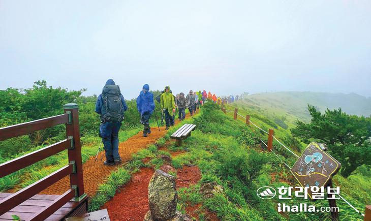 지난달 29일 진행된 한라일보의 '2024 제주섬 글로벌 에코투어' 행사는 개인적으로 최초의 우중산행이었다. 애초의 트레킹 동선은 13㎞의 짧지 않은 여정이었지만 예상밖의 폭풍우로 족은노꼬메 둘레길과 바리메 정상과 둘레길이 취소되면서 비교적 짧은거리로 수정될 수밖에 없었다.