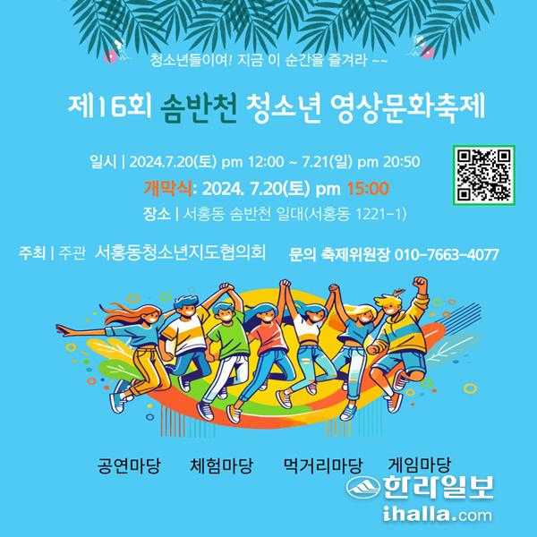 서귀포시 서홍동청소년지도협의회가 주최·주관하는 이번 축제는 20~21일 이틀 동안 솜반천(서홍동 1221-1번지 일원)에서 진행된다. 축제는 체험 마당, 공연 마당, 먹거리 마당, 게임 마당으로 구성됐다.