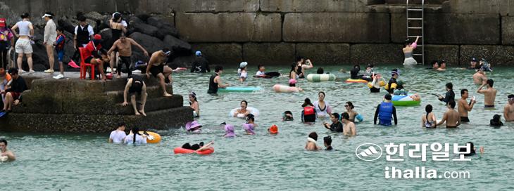 [한라일보] 연일 폭염이 기승을 부리는 가운데 지난 20일 제주시 한경면 판포리 포구에 많은 피서객이 찾아 물놀이를 즐기고 있다. 강희만기자