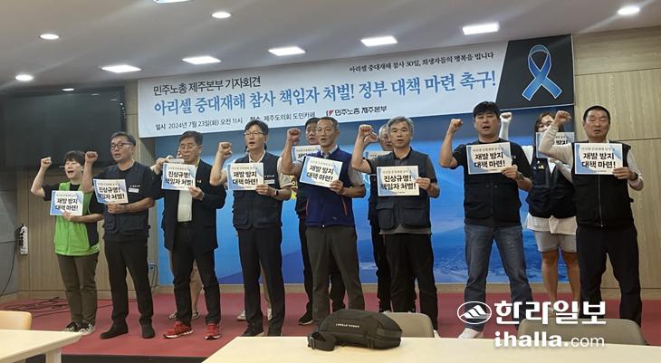 민주노총 제주본부는 23일 제주도의회 도민카페에서 '아리셀 중대재해 참사 책임자 처벌 및 정부 대책 마련 촉구' 기자회견을 열었다.