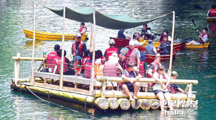 [한라일보] 낮 최고기온이 30℃를 웃도는 무더위가 연일 이어지고 있다. 23일 서귀포시 쇠소깍을 찾은 관광객들이 전통 테우 체험을 하며 더위를 식히고 있다. 이상국기자