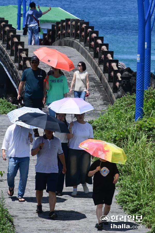 [한라일보] 24일 제주시 함덕해수욕장을 찾은 관광객들이 뜨거운 햇살을 피하기 위해 양산을 쓰고 주변을 구경하고 있다. 이상국기자