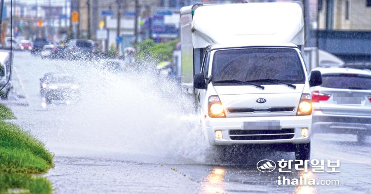 [한라일보] 24일 제주시 구좌읍 김녕리에 집중호우가 쏟아진 가운데 차량들이 물웅덩이를 조심스럽게 지나고 있다. 이상국기자