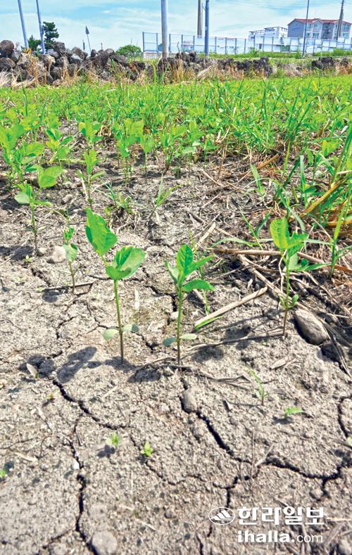 [한라일보] 연일 폭염경보가 이어지는 가운데 24일 제주시 조천읍 신촌리 한 콩밭이 거북등처럼 갈라지며 농작물 생육을 방해하고 있다. 강희만기자