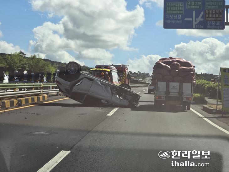 29일 제주시 애월읍 고성리의 한 도로에서 발생한 차량 전복사고. 독자 제공
