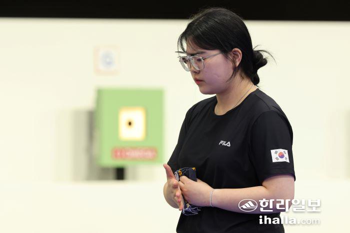 긴장감으로 과녁을 조준한 뒤 손수건으로 손을 닦는 오예진. 연합뉴스
