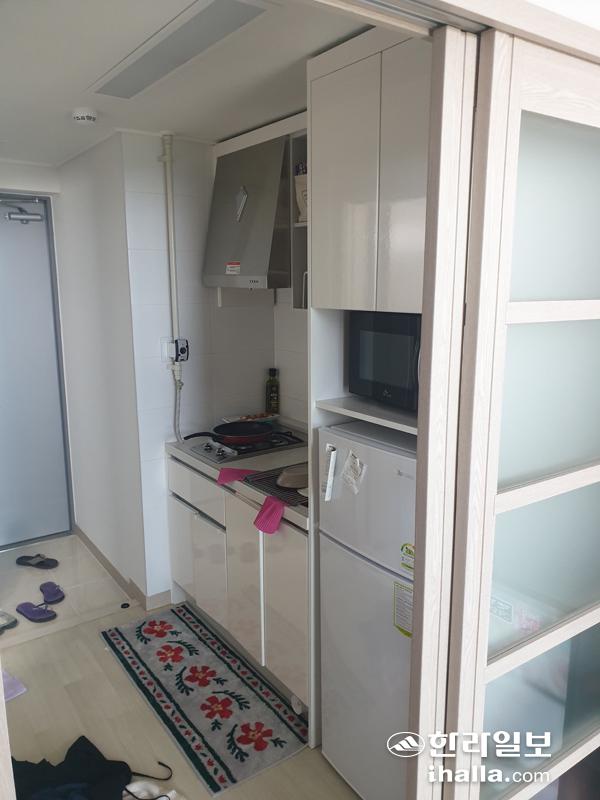 서진영 씨가 지난해 결혼 전까지 살았던 서귀포시 내 행복주택의 내부. 5평 정도로 공간이 좁다 보니 출입구에 맞닿아 주방이 설치돼 있다.