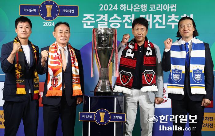 5일 오후 서울 종로구 축구회관에서 열린 2024 하나은행 코리아컵 준결승 대진 추첨 미디어데이에서 각 팀 감독들이 기념촬영을 하고 있다.왼쪽부터 광주 FC 이정효 감독, 제주 유나이티드 김학범 감독, 포항 스틸러스 박태하 감독, 울산 HD FC 김판곤 감독. 연합뉴스