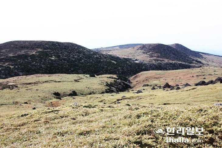가장 왼쪽이 윗세오름(붉은오름), 가운데가 세오름(누운오름), 가장 오른쪽은 윗세족은오름으로 부르는 봉우리다. 윗세오름 자락에 대피소 건물이 보인다. 김찬수