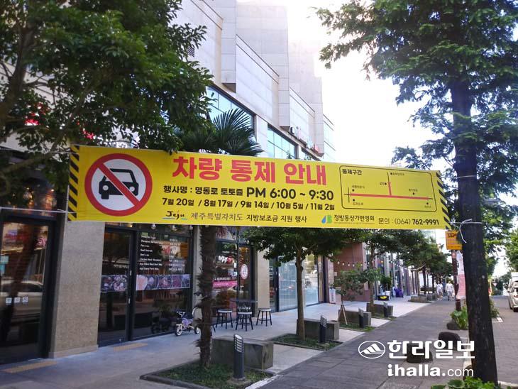 이중섭거리에 '명동로 토토즐' 운영으로 차량을 통제한다는 알림 현수막이 걸려 있다. 사진=진선희기자