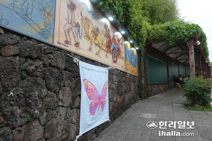 이중섭거리 야외 전시장 인근에 주말과 공휴일 서귀포예술시장 운영을 알리는 자그만 현수막이 달려 있다.