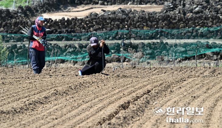 [한라일보] 7일 제주시 구좌읍 행원리의 한 당근밭에서 농민들이 물을 주기 위해 스프링클러를 설치하고 있다. 당근이 한창 파종시기를 맞았지만 비가 내리지 않고 더위가 계속되면서 발아율이 떨어져 농가의 시름이 깊어지고 있다. 강희만기자