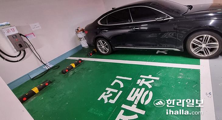또 주차장 벽에 설치된 완속충전기에는 빨간 글씨로 '고장'이라고 쓴 A4용지가, 바로 옆 벽면에는 '고장, 수리 요청 중'이라고 적힌 또다른 A4용지가 각각 붙어 있다.
