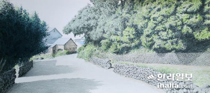 천에 수를 놓듯이 그려야 발생되는 광선이 있다. 울창한 나무숲의 8월. 폭염에도 아랑곳 하지 않는 품격을 그리려 하였다. 마을의 유구한 역사성을 보여주는 금산공원과 잇닿은 밭이며 동백나무 그림자 드리운 길. 그리고 원경에 보이는 집들이 거대한 짜임을 이루고 있다. 나무 색의 미세한 차이와 명암으로 넘실거리는 풍요로운 생명력을 연필담채로 담아내는 것은 며칠에 걸친 각고의 산물이다. 원시림과 경계를 이룬 밭담에 내려앉은 그림자가 나무의 공간감과 깊이를 알려주고 있다. 뙤약볕에 노출된 길과 밭 사이 돌담 행렬은 이 섬이 지니고 있는 독특한 서정성을 여과 없이 보여준다. 눈부신 광선의 양을 표현하는 일은 수채화가 보유한 지극히 괴로운 과정이거니와 세심한 밀도 차이가 상호 작용해야 한다. 하늘에 색을 일부러 칠하지 않은 이유는 어딘가 모르는 동양화적 정한을 끌어오기 위함이다.
