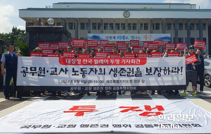 공무원·교원 생존권 쟁취 공동투쟁위원회가 9일 제주도청 앞에서 공무원 실질임금 삭감을 규탄하는 기자회견을 열고 있다. 사진=제주도공무원노동조합