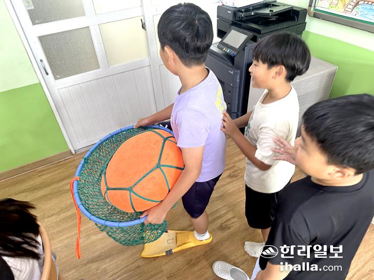 지난달 23일 '2024 찾아가는 독도 해녀 교실'이 애월초등학교 4학년 학생들을 대상으로 진행됐다. 김하영 강사가 테왁과 망사리를 보여주며 아이들에게 설명하고 있다.