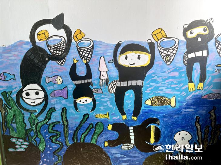애월초 계단 벽면에 그려져 있는 해녀 그림들, 수업 전에도 아이들은 해녀에 대한 관심을 가지고 있었다.