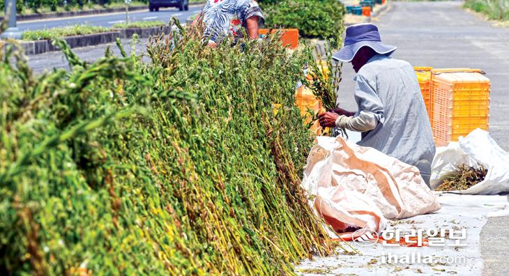 [한라일보] 강한 햇볕이 내리 쬔 지난 10일 제주시 한경면 도로변에서 한 농민이 수확한 참깨를 말리고 있다. 이상국기자