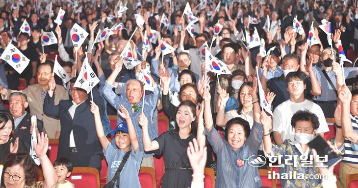 15일 제주학생문화원 대극장에서 '제79주년 광복절 경축식'이 열린 가운데, 참석자들이 만세 삼창을 하고 있다. 이상국기자