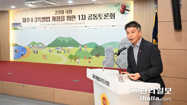 19일 제주특별자치도의회 대회의실에서 열린 '22대 국회 제주4·3특별법 개정을 위한 1차 공동 토론회'에서 주제발표에 나선 양성주 제주4·3희생자유족회 부회장은 "2021년에 전부 개정된 4·3특별법은 많은 부분에서 성과가 있었지만 여전히 개정 필요성이 있다는 논의가 진행 중"이라며 이같이 말했다. 토론회는 제주 위성곤·김한규·문대림 국회의원과 제주도의회, 제주4·3희생자유족회, 제주4·평화재단, 제주4·3연구소 등이 공동 주최했다.