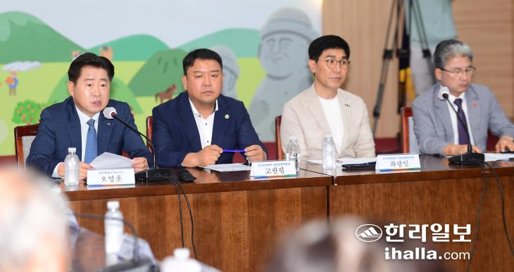 21일 오전 제주도의회 의원회관 대회의실에서 기초자치단체 도입 도민운동본부(이하 도민본부)와 제주자치도, 제주도의회 간의 간담회가 개최되고 있다. 사진 왼쪽부터 오영훈 제주지사, 고권필·좌광일 도민운동본부 공동집행위원장, 이상봉 제주도의회 의장.