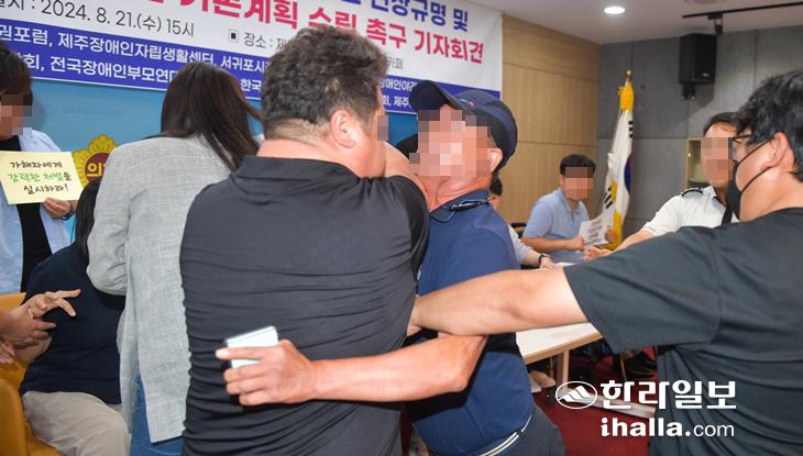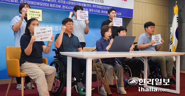 제주장애인인권포럼, 제주장애인자립생활센터 등 도내 8개 단체는 21일 제주도의회 도민카페에서 진상조사 촉구 기자회견을 열었다. 이상국기자
