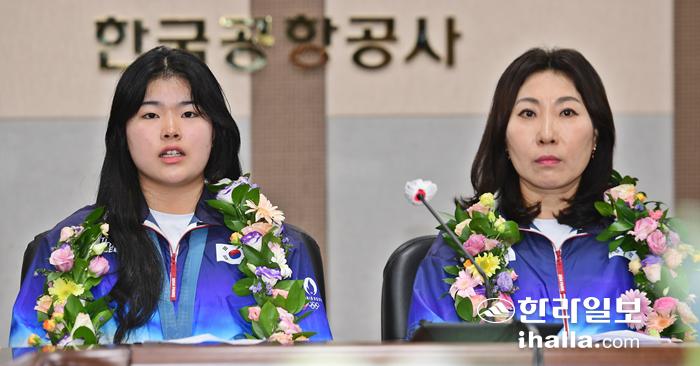 24일 제주국제공항 대회의실에서 기자회견 하는 오예진 선수와 홍영옥 코치. 이상국 기자