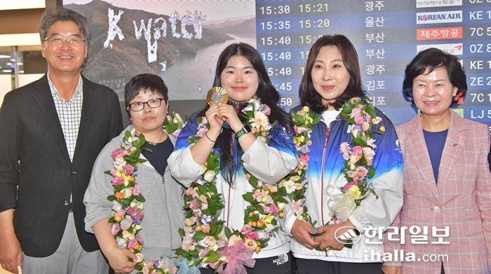 24일 제주공항을 통해 금의환향한 파리올림픽 사격 금메달 리스트 오예진 선수. 왼쪽부터 신진성 도체육회장, 오 선수의 어머니, 오예진 선수, 홍영옥 코치, 김애숙 정무 부지사. 이상국 기자