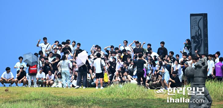 [한라일보] 불볕더위가 기승을 부린 23일 국토 최남단 마라도를 찾은 관광객들이 단체사진을 찍고 있다. 강희만기자