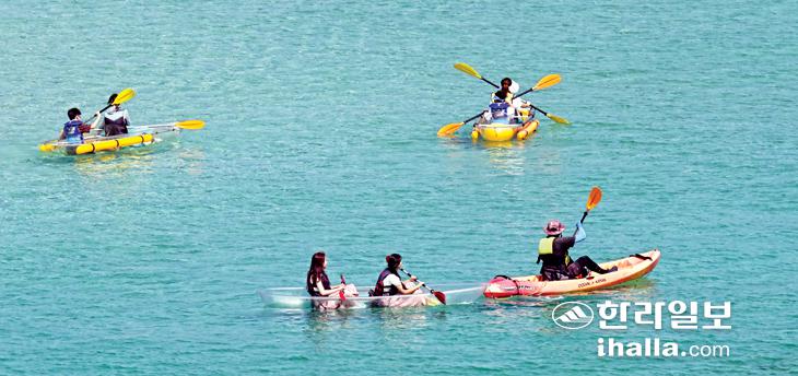 [한라일보] 26일 제주시 애월읍 한담해변을 찾은 관광객들이 투명카약을 타며 즐거운 시간을 보내고 있다. 강희만기자
