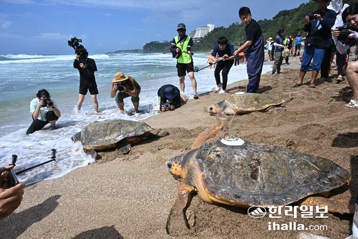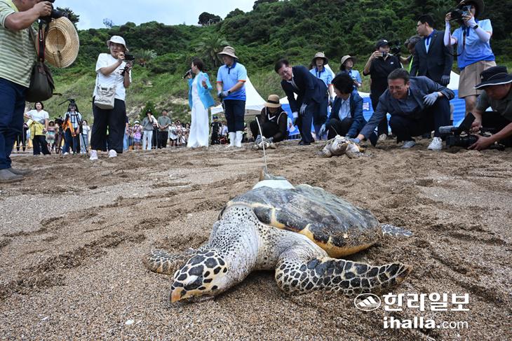28일 서귀포시 중문 색달해변에서 바다거북 방류 행사가 열리고 있다. 강희만기자