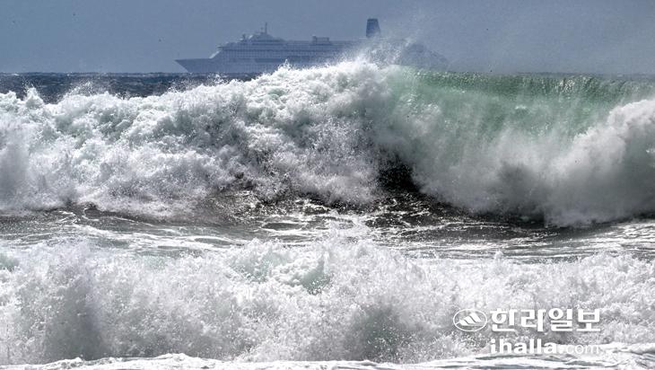 제10호 태풍 '산산'이 일본을 향해 북상하는 가운데 28일 서귀포시 하례동 해안에 태풍의 간접 영향으로 인해 거센 파도가 밀려오고 있다. 강희만기자